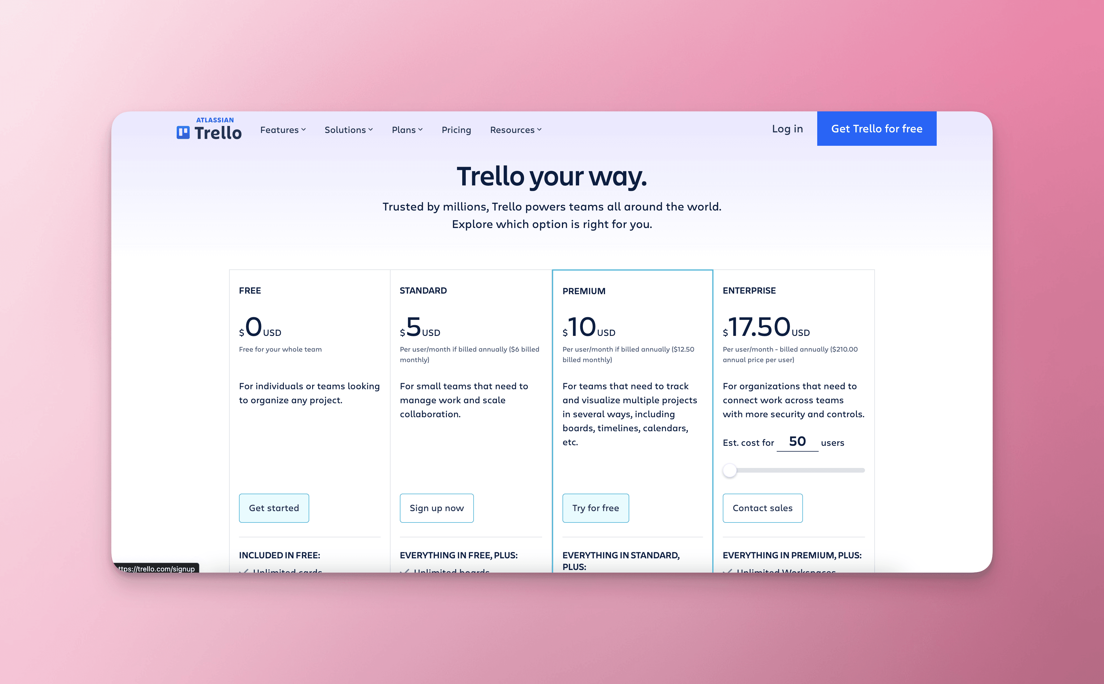 Free: As the name suggests, this is a cost-free plan that suits those looking for basic project organization. It includes unlimited cards, up to 10 boards per Workspace, and unlimited Power-Ups per board. To see a full list of features, visit Trello's pricing page.
